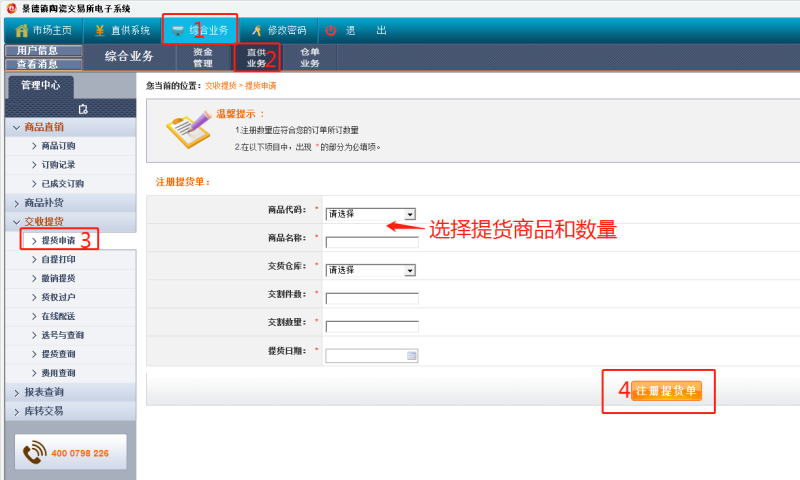 登錄客戶端---綜合業(yè)務(wù)---直供業(yè)務(wù)---提貨申請---注冊提貨單