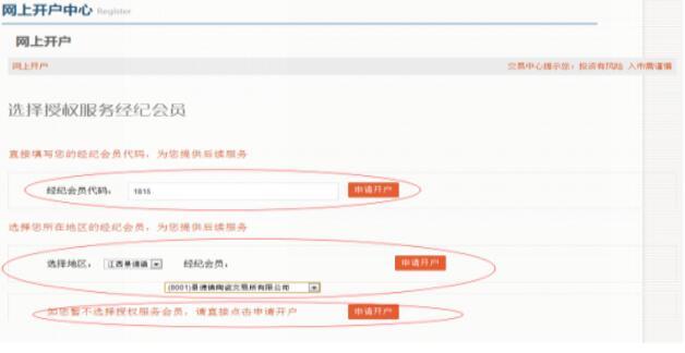 3、點(diǎn)擊“網(wǎng)上開戶”進(jìn)入選擇:(方式一:若您有為自己服務(wù)的經(jīng)紀(jì)會(huì)員,可以直接輸入代碼,點(diǎn)擊申請(qǐng)開戶;方式二:自行選擇經(jīng)紀(jì)會(huì)員,點(diǎn)擊選擇地區(qū),選擇經(jīng)紀(jì)會(huì)員,申請(qǐng)開戶;方式三:直接點(diǎn)擊申請(qǐng)開戶)