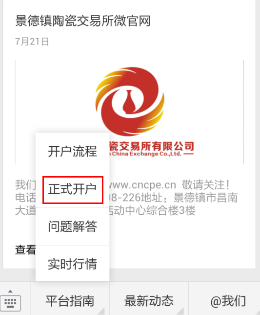 2、持有平安銀行卡或已開通平安易寶用戶請進入微信公眾號(景德鎮(zhèn)陶瓷交易所有限公司),在底部找到‘平臺指南->正式開戶’: