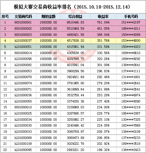 景德鎮(zhèn)陶瓷交易所首屆昌南杯模擬交易大賽10月18日火熱開(kāi)賽以來(lái),參賽人數(shù)持續(xù)攀升。通過(guò)近兩個(gè)月模擬交易大賽的鍛煉,參與模擬交易大賽的投資人會(huì)員對(duì)陶瓷藝術(shù)品投資的認(rèn)知度不斷提高,比賽也漸入佳境。截止12月14日收盤(pán),模擬賬號(hào)"8001000001"以總收益率761.04%的成績(jī)拔得頭籌。"8001000002"以總收益451.05%的成績(jī)緊隨其后。"8001000003"以總收益388.04%成績(jī)位列第三。前二十選手的總收益也都在100%以上,值得慶賀。接下來(lái)的賽況如何,我們拭目以待!報(bào)名入口請(qǐng)點(diǎn)擊
