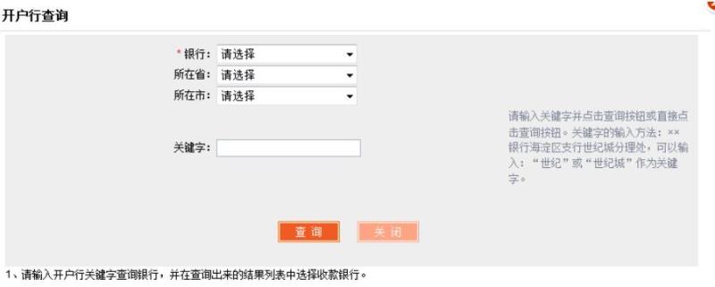 步驟二:選擇相應的銀行開戶行、所在省、所在市,可以通過關鍵字查詢