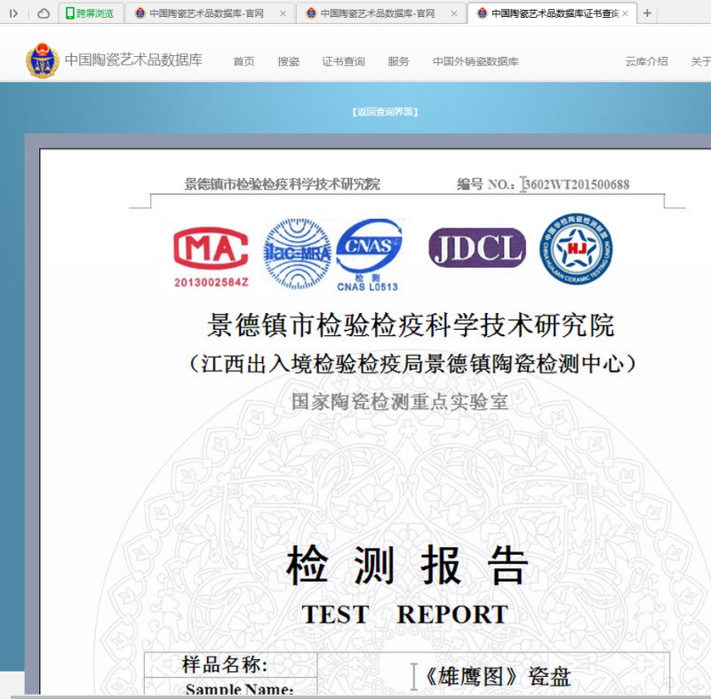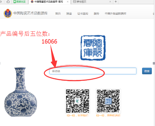2、進(jìn)入中國(guó)陶瓷藝術(shù)品數(shù)據(jù)庫官網(wǎng)頁面,在圖二的選中區(qū)域輸入圖一中產(chǎn)品編號(hào)后五位數(shù)字“16066”,即可檢索到該編號(hào)產(chǎn)品可供對(duì)外查詢信息(每個(gè)產(chǎn)品對(duì)外可查詢一個(gè)體視顯微鏡照片數(shù)據(jù))
