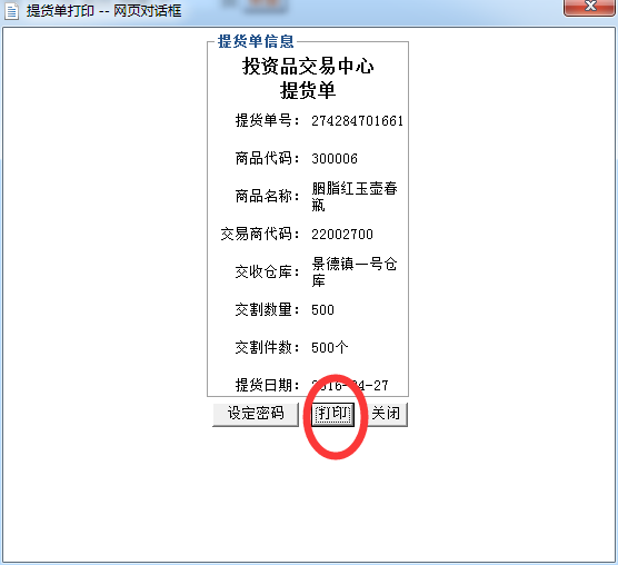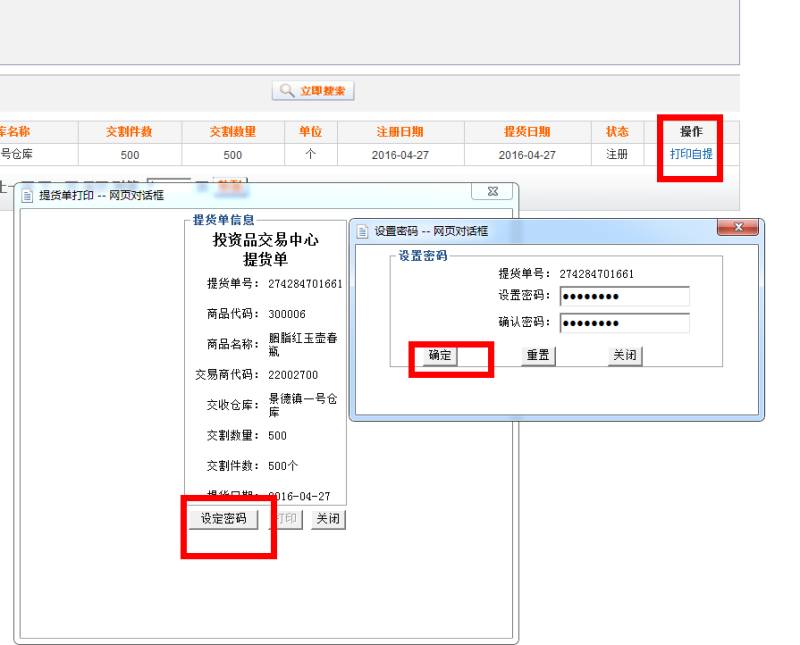 綜合業(yè)務(wù)---發(fā)售業(yè)務(wù)---交收提貨---自提打印,設(shè)定提貨密碼、打??;