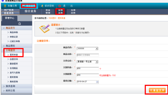 1.1、登錄客戶端,綜合業(yè)務(wù)---發(fā)售業(yè)務(wù)---交收提貨---提貨申請,注冊提貨單;