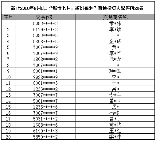 意向參與配售活動的廣大投資人可以抓緊時間積極參與,爭取更大的獲利機會。截至8月1日獲得活動配售資格的前20名投資人如下表: