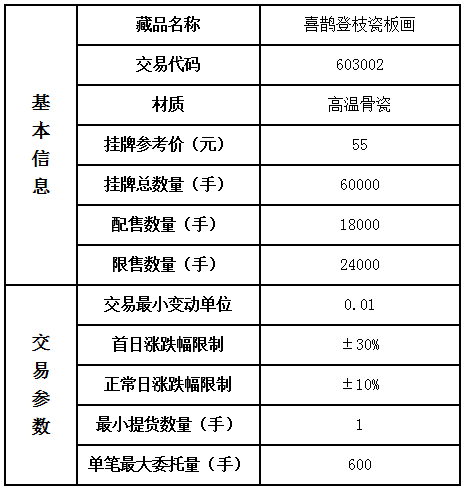 經景德鎮(zhèn)陶瓷交易所(以下稱本交易所)投資人會員申請,本交易所專家委員會、新藏品掛牌審核小組評估審核通過,對已經完成托管入庫的藏品《喜鵲登枝瓷板畫》,準予在本交易所線上實物交易系統(tǒng)正式掛牌交易,具體事項公告如下: