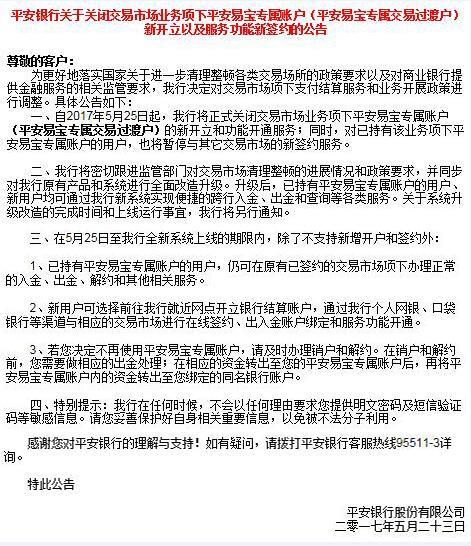 接平安銀行通知,自2017年5月25日起平安銀行系統(tǒng)將停止平安易寶賬戶(hù)的新開(kāi)立和現(xiàn)有平安易寶用戶(hù)的新簽約服務(wù)。具體情況如下: